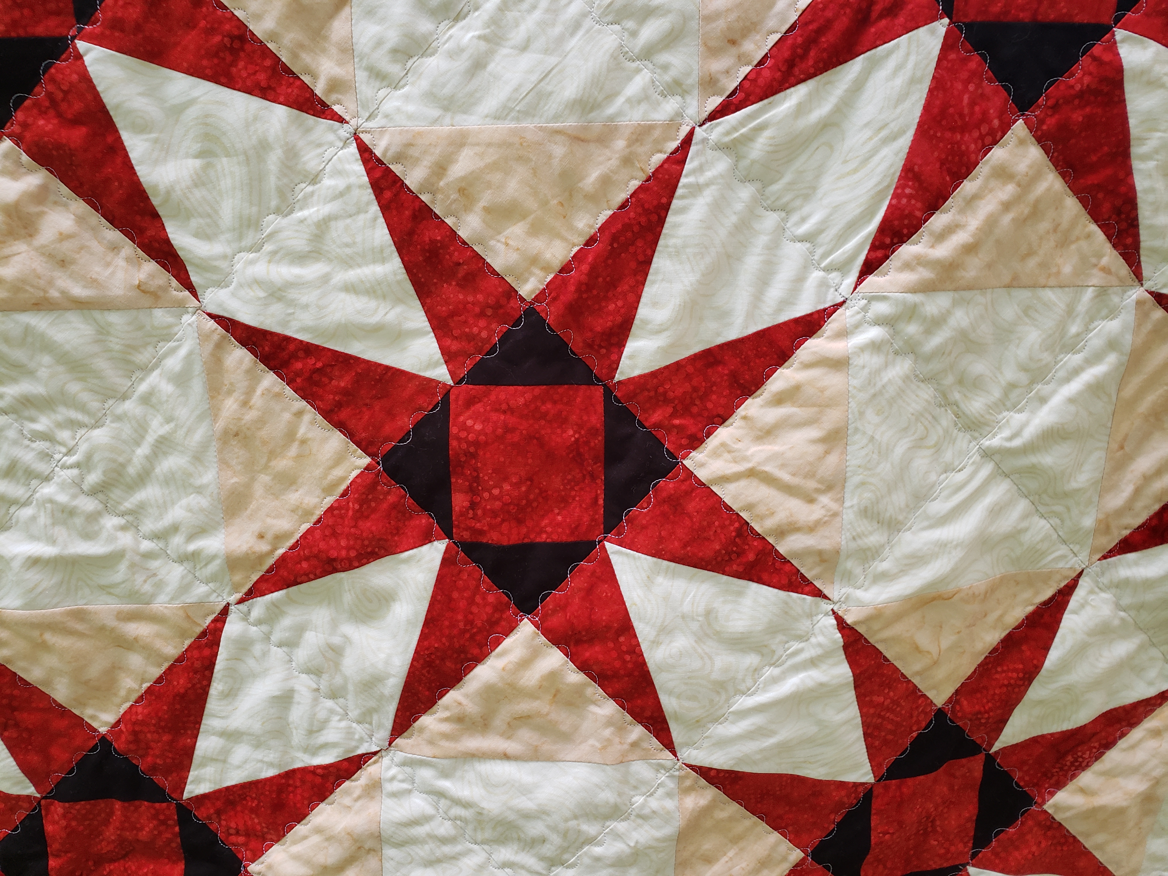 I used four fabrics, all from Island Batik. The background is Milkshake, the light triangles are Shell, the main red is a red blender that I don't know the name of, and there's a bit of solid black. I'm happy with how it turned out!